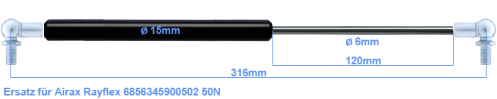 Ersatz Gasdruckfeder für Airax Rayflex 6856345900502 50 Newton. Geeignet für Kugeln mit Durchmesser von 10mm. Die Kugel ist inbegriffen. Marke: Hahn Gasfedern.