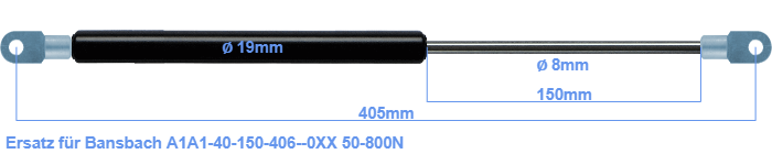 Ersatz Gasdruckfeder für Bansbach A1A1-40-150-406--0XX 50-800 Newton. Die Stärke des Auges beträgt 5mm und der Lochdurchmesser ist 8.1mm. Marke: Hahn Gasfedern.