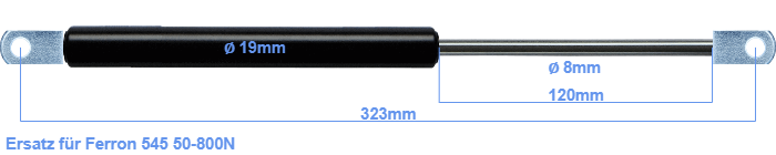 Ersatz Gasdruckfeder für Ferron 545 50-800 Newton. Die Stärke des Auges beträgt 10mm und der Lochdurchmesser ist 8.1mm. Marke: Hahn Gasfedern.