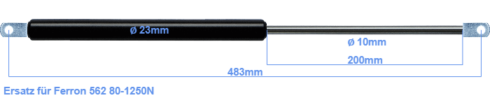 Ersatz Gasdruckfeder für Ferron 562 80-1250 Newton. Die Stärke des Auges beträgt 10mm und der Lochdurchmesser ist 8.1mm. Marke: Hahn Gasfedern.