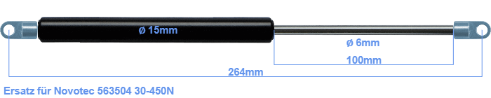 Ersatz Gasdruckfeder für Novotec 563504 30-450 Newton. Die Stärke des Auges beträgt 3mm und der Lochdurchmesser ist 6.1mm. Marke: Hahn Gasfedern.