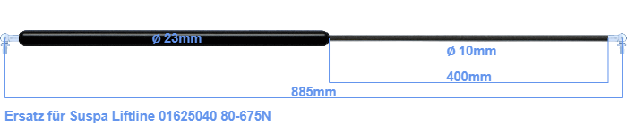 Ersatz Gasdruckfeder für Suspa Liftline 01625040 80-675 Newton. Geeignet für Kugeln mit Durchmesser von 10mm. Die Kugel ist inbegriffen. Marke: Hahn Gasfedern.